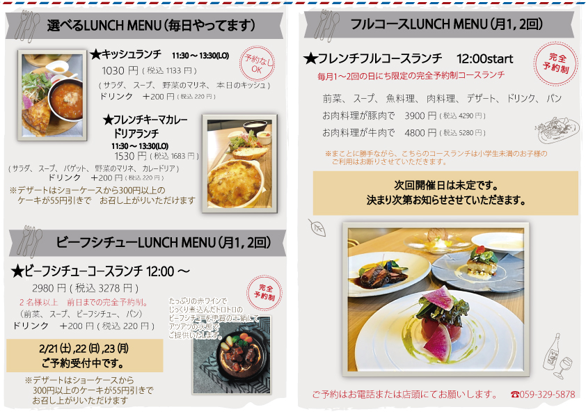 ランチ、カフェの営業は1/9(金)までお休みとなります。